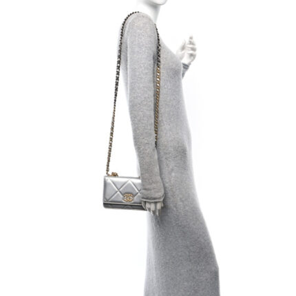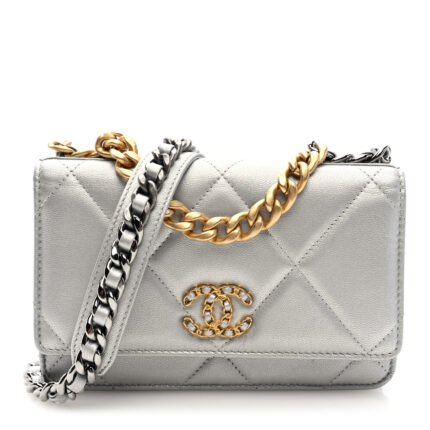 Metallic Lambskin Quilted Chanel 19 Wallet On Chain WOC Silver