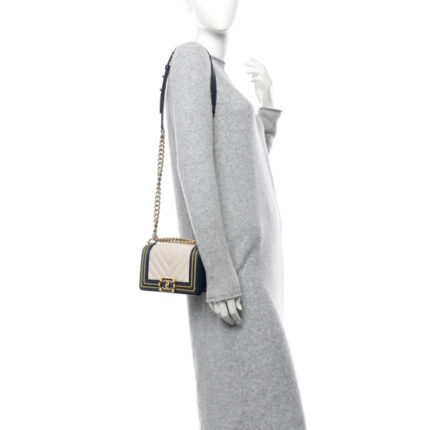 Calfskin Chevron Quilted Braided Small Boy Flap White Navy