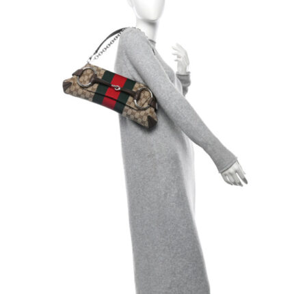 Monogram Textured Dollar Calfskin Heavy Grosgrain Web Medium Maxi Horsebit Chain Shoulder Bag Beige Ebony New Acero