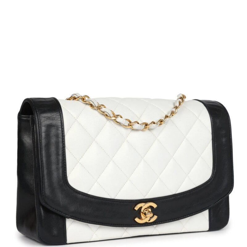 Vintage Chanel Medium Diana Flap Bag White and Black Lambskin Gold Hardware