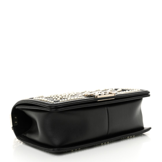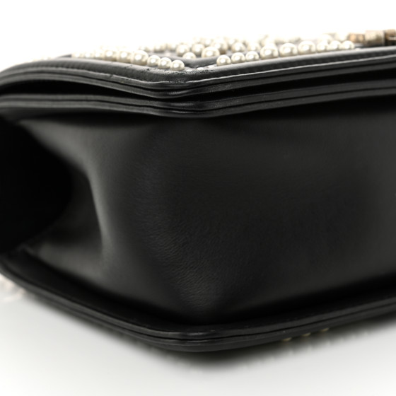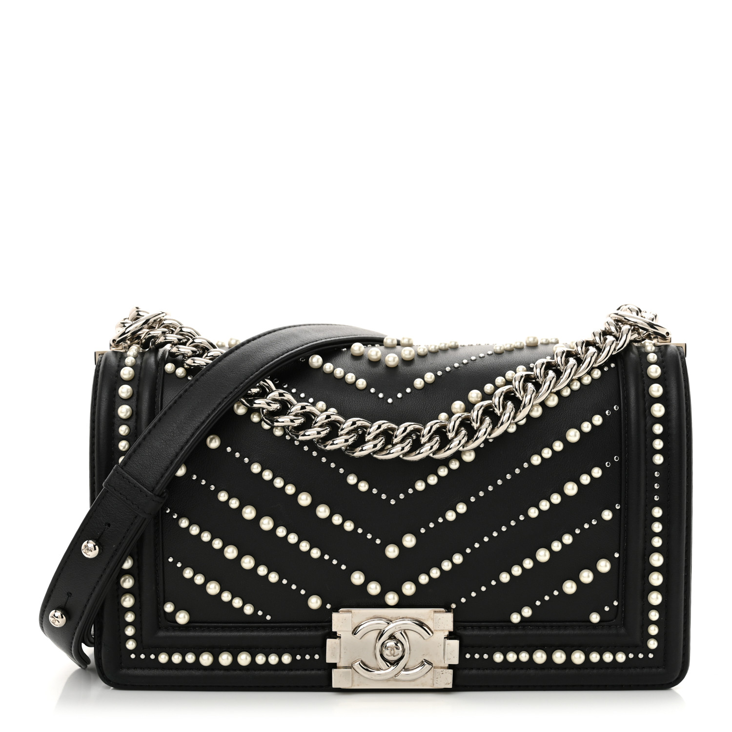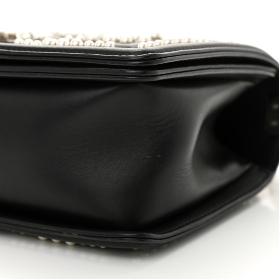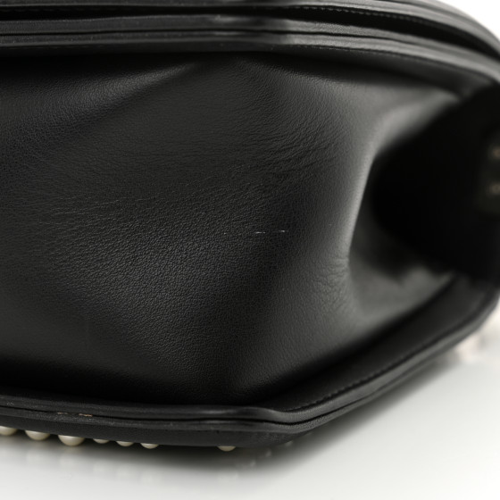 - Materials: Calfskin leather in black with resin pearl beads arranged in a chevron pattern on the front flap
