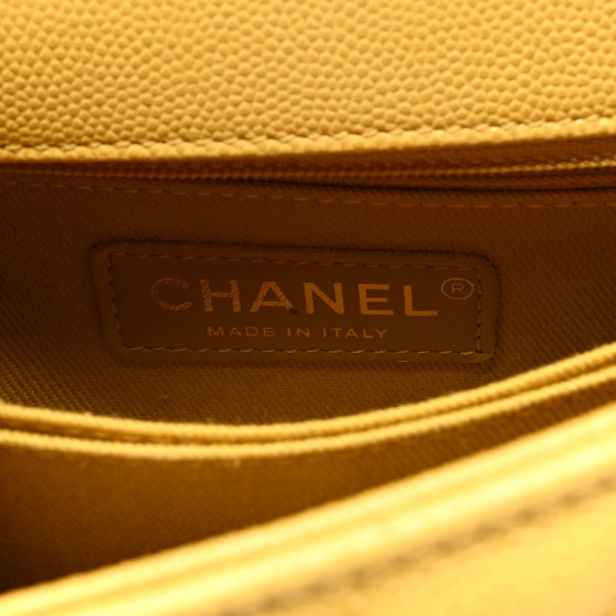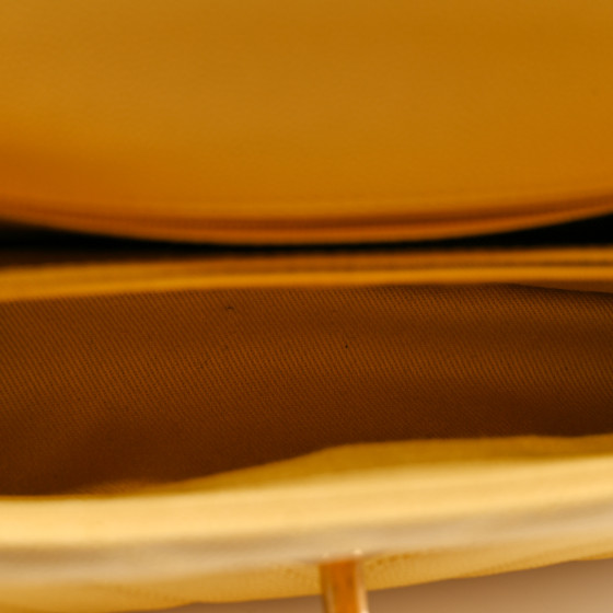 - Interior: Matching aged gold classic CC turn lock to a partitioned yellow fabric interior with a zipper pocket