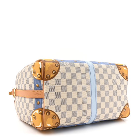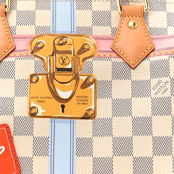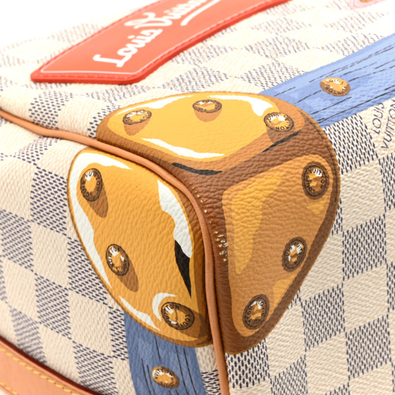 - Materials: Signature damier azur coated canvas in blue and white with a print of LV luggage trunks and vachetta leather trim