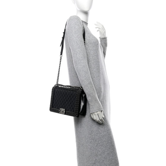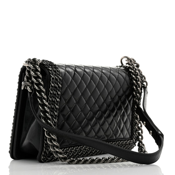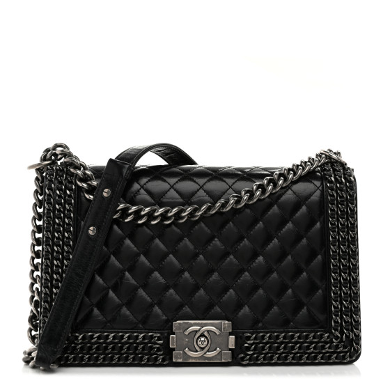 • Materials: Luxurious diamond-quilted calfskin leather with a border of ruthenium chains around the body of the bag