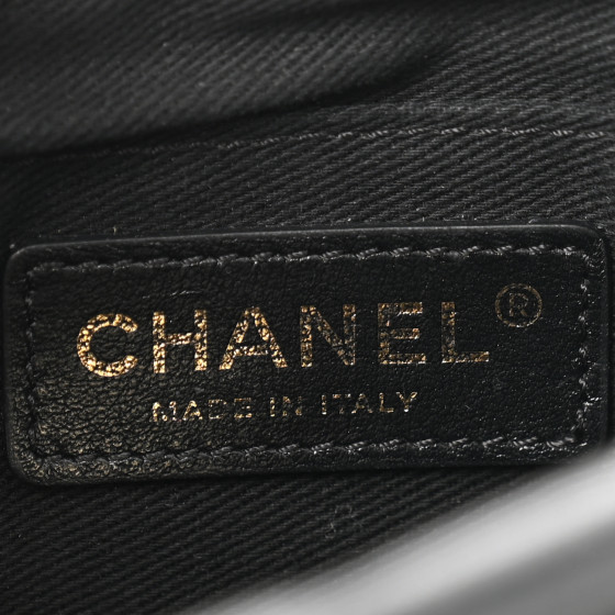- Strap/Handles: Long gold chain link leather threaded shoulder strap, and a gold Chanel CC turn lock on the front to secure the front pocket