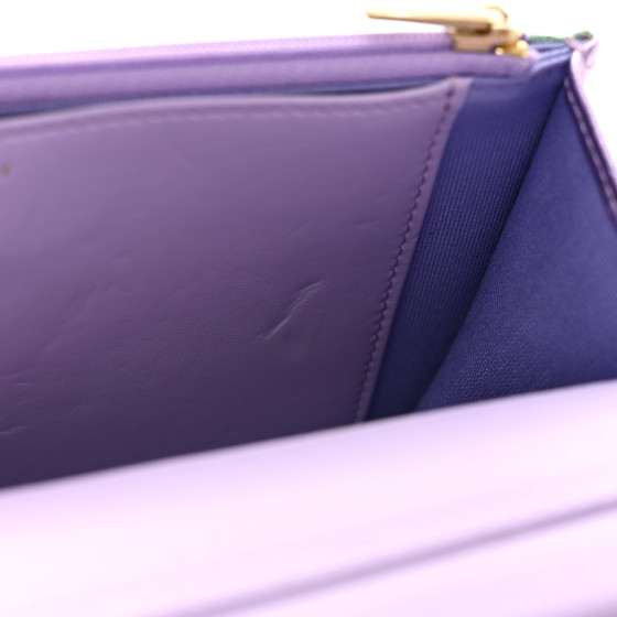 - Interior: Compact purple leather interior with a zipper compartment and card slot