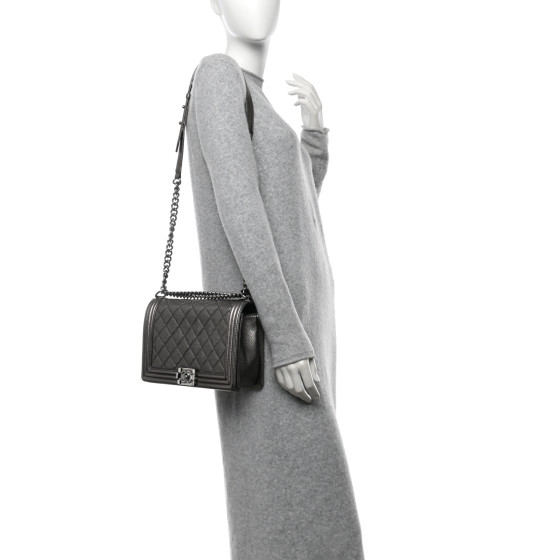 - Strap/Handles: Dark silver chain-link shoulder straps with a leather shoulder pad and a Chanel boy CC push lock