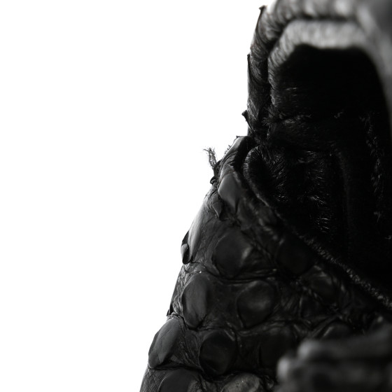 - Materials: Fine metallic snakeskin in black with sequins and beads