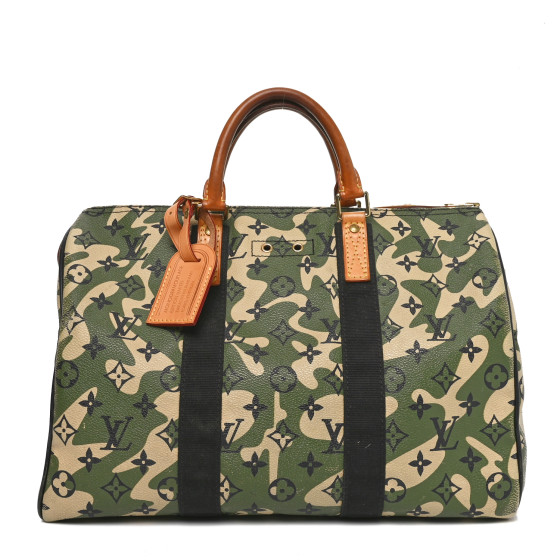 - Materials: A black LV monogram print on ivory and green camouflage canvas