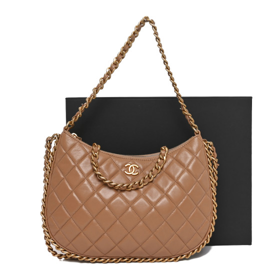 Shiny Crumpled Lambskin Quilted Large Trendy Chain Around Hobo Dark Beige