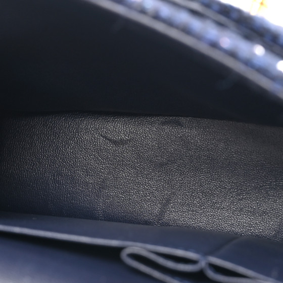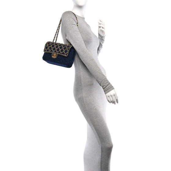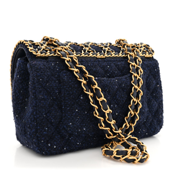 Tweed Sequin Timeless Classic Chained Double Flap Navy Blue
